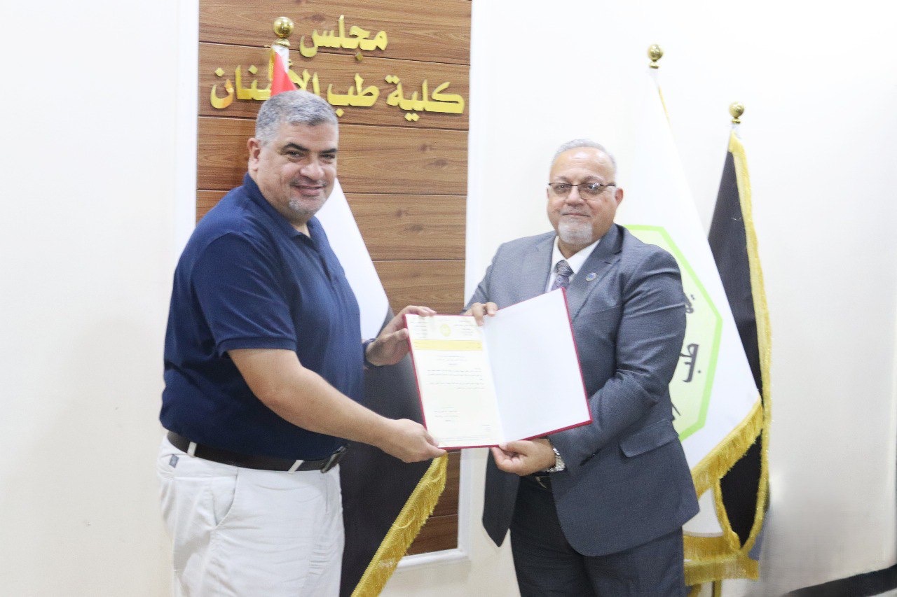 كرم السيد عميد كلية طب الأسنان في جامعة بغداد الأستاذ الدكتور رغد عبد الرزاق محمد المحترم، الاستاذ الدكتور ضياء حسين عبد عون بمناسبة انتهاء فترة توليه مهام رئاسة فرع تقويم الأسنان في الكلية.