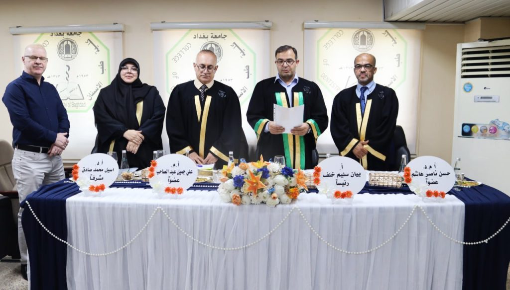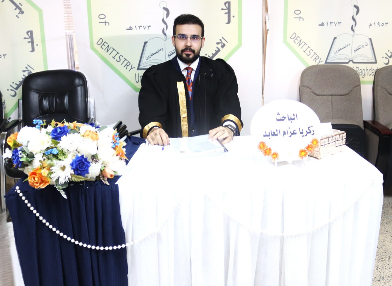 ناقشت كلية طب الاسنان بجامعة بغداد رسالة الماجستير الموسومة” دراسة تأثير إضافة سترونتيوم تيتانات على الخصائص المضادة للفطريات والفيزيائية والميكانيكية للبطانة اللينة المصنوعة من الأكريليك للأسنان الصناعية” (دراسة مختبرية)، للطالب زكريا عزام العابد.