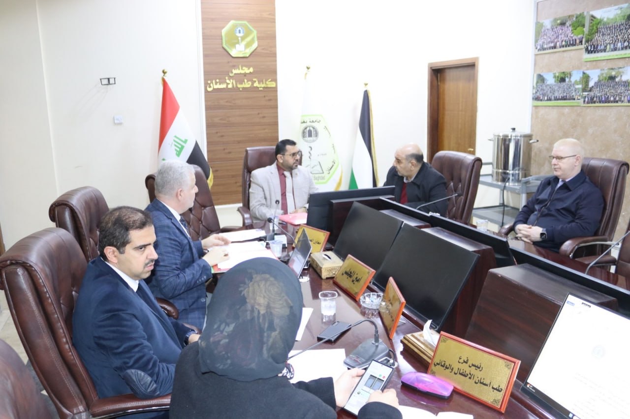 عقد الاجتماع الدوري لمجلس كلية طب الاسنان في جامعة بغداد حيث انعقدت الجلسة الثانية عشر يوم الاربعاء الموافق 24/12/2025 برئاسة الأستاذ الدكتور علي البستاني معاون العميد للشون العلمية والطلبة وبحضور السيد معاون العميد للشؤون الادارية ورؤساء الفروع العلمية.