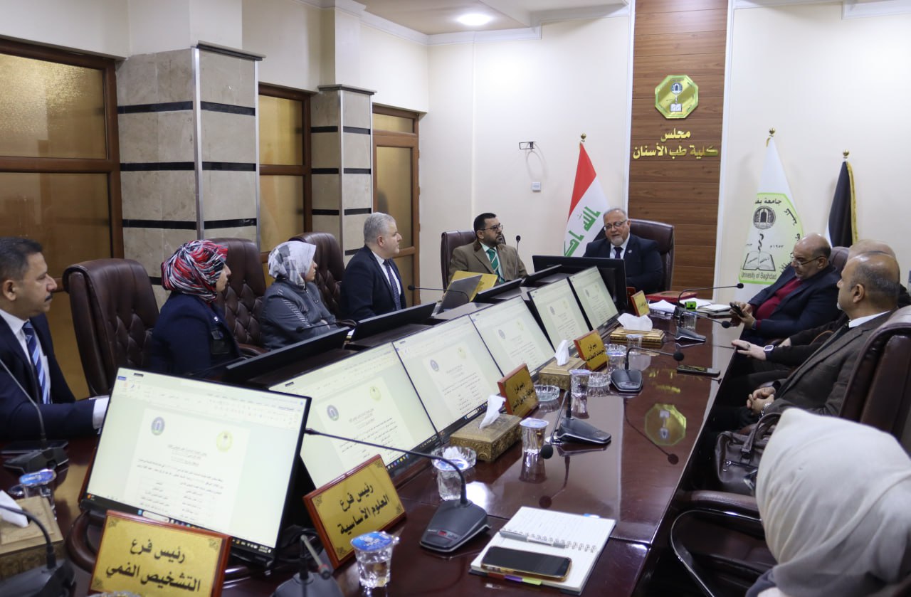 عقد الاجتماع الدوري لمجلس كلية طب الاسنان في جامعة بغداد حيث انعقدت الجلسة السادسة عشر يوم الثلاثاء الموافق 27/1/2026 برئاسة الأستاذ الدكتور رغد عبد الرزاق محمد المحترم ومساعد رئيس الجامعة للشؤون الإدارية – المخوّل بتسيير شؤون الجامعة، وبحضور السادة المعاونين ورؤساء الفروع العلمية.