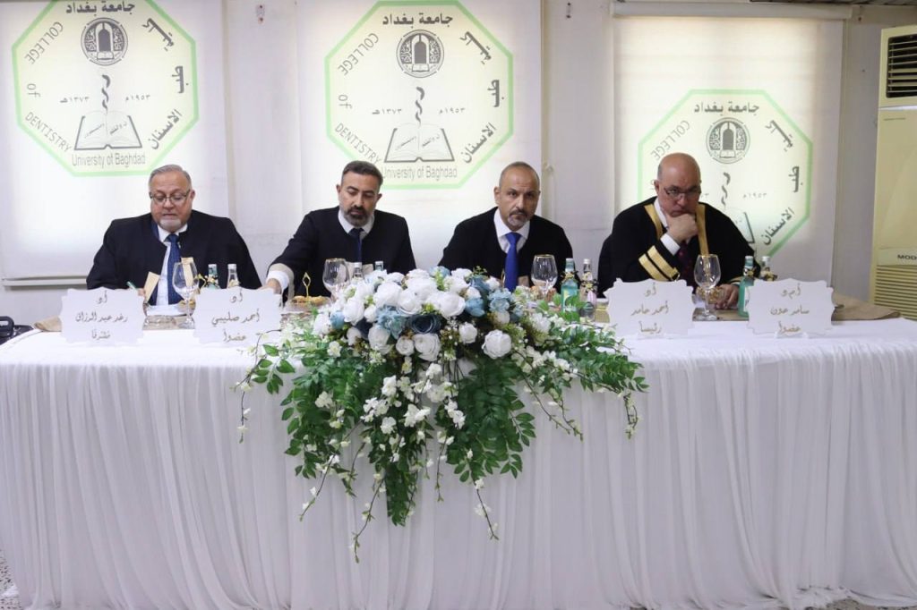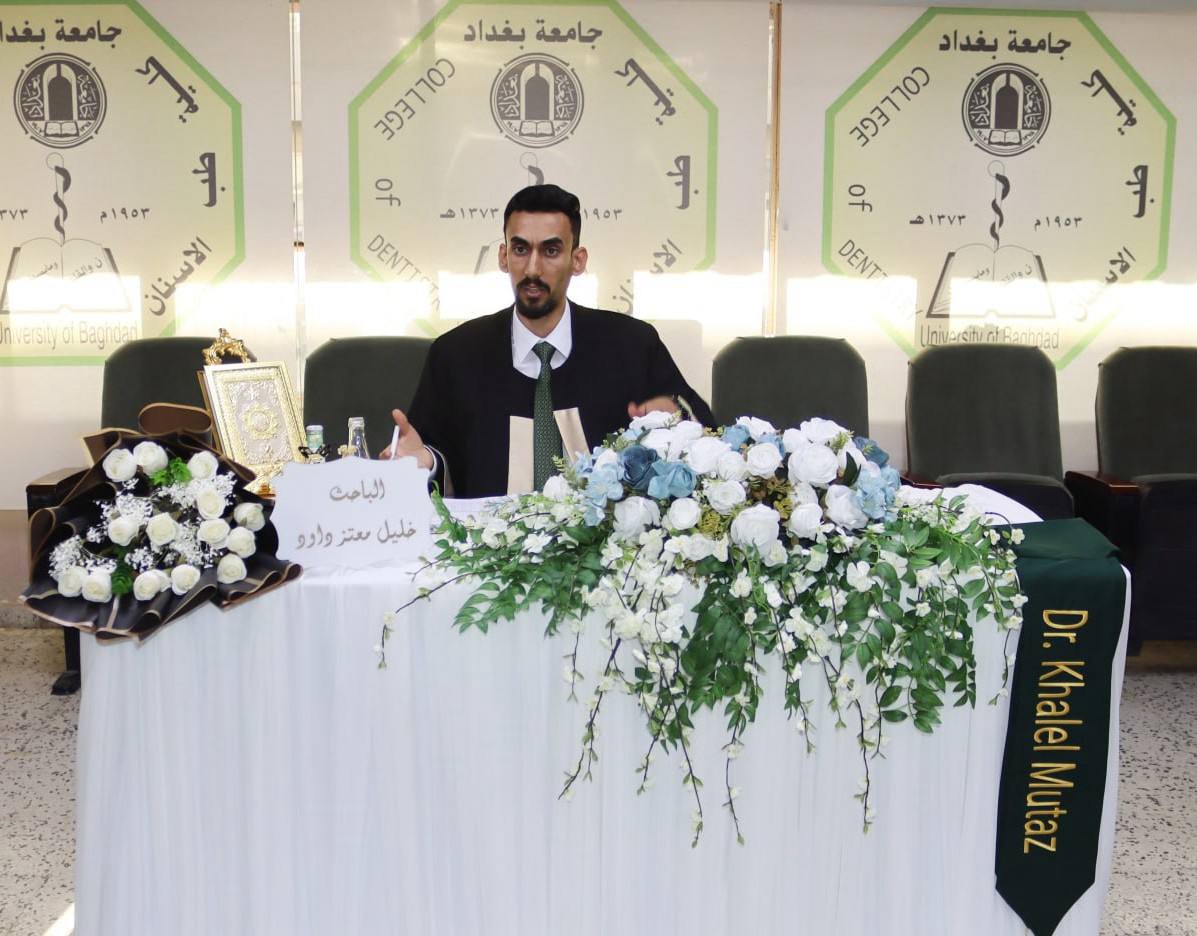 ناقشت كلية طب الاسنان بجامعة بغداد رسالة الماجستيرالموسومة (تقييم حجم بقايا مادتين مانعتين للتسرب بعد إعادة تنظيف القناة الجذرية باستخدام تقنية التصوير ثلاثي الأبعاد: دراسة مقارنة مخبرية)، للطالب خليل معتز داود.