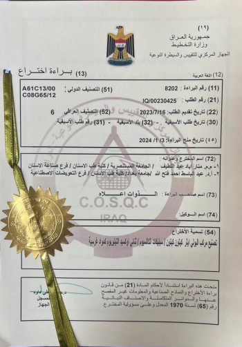 حصل الاستاذ الدكتور عبدالباسط احمد فتح الله التدريسي في كلية طب الأسنان جامعة بغداد بالتعاون مع طالبة الدكتوراه منار اياد عبداللطيف في جامعة بغداد على براءة اختراع من الجهاز المركزي للتقييس والسيطرة النوعية لتمكنهم من تصنيع مركب البولي إيثر إيثر كيتون/ سيليكات الكالسيوم/ثنائي أوكسيد التيليريوم كمواد غرسية وتستعمل براءة الاختراع مواد مصنعة بطرق حديثة لغرض استخدامها كزرعات الأسنان وتحسين تجانسها مع عظم الفك المحيط بها. وياتي هذا الإنجاز العلمي المتميز من خلال الدعم اللامتناهي من قبل عمادة الكلية متمثلة بالسيد العميد المحترم وتوفير كافة المتطلبات اللازم لاتمام انجاز البحوث العلمية.
