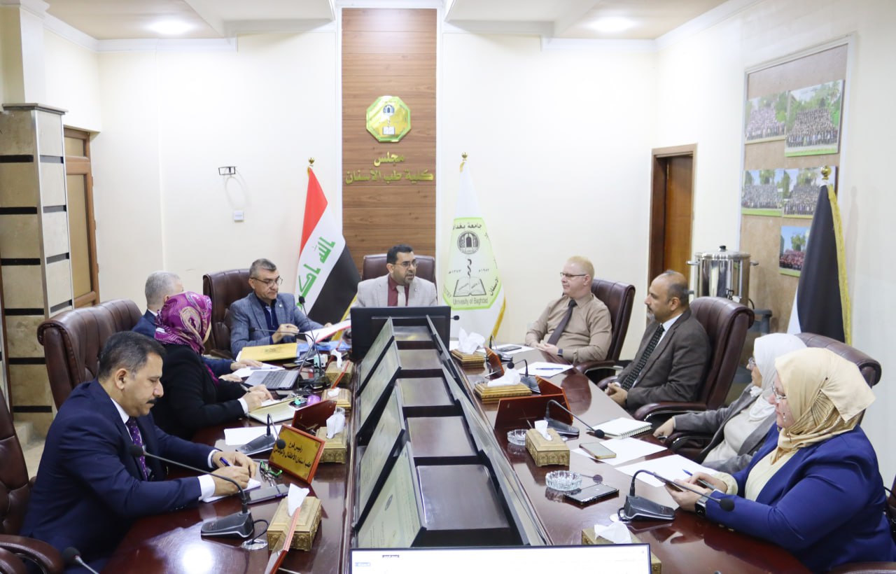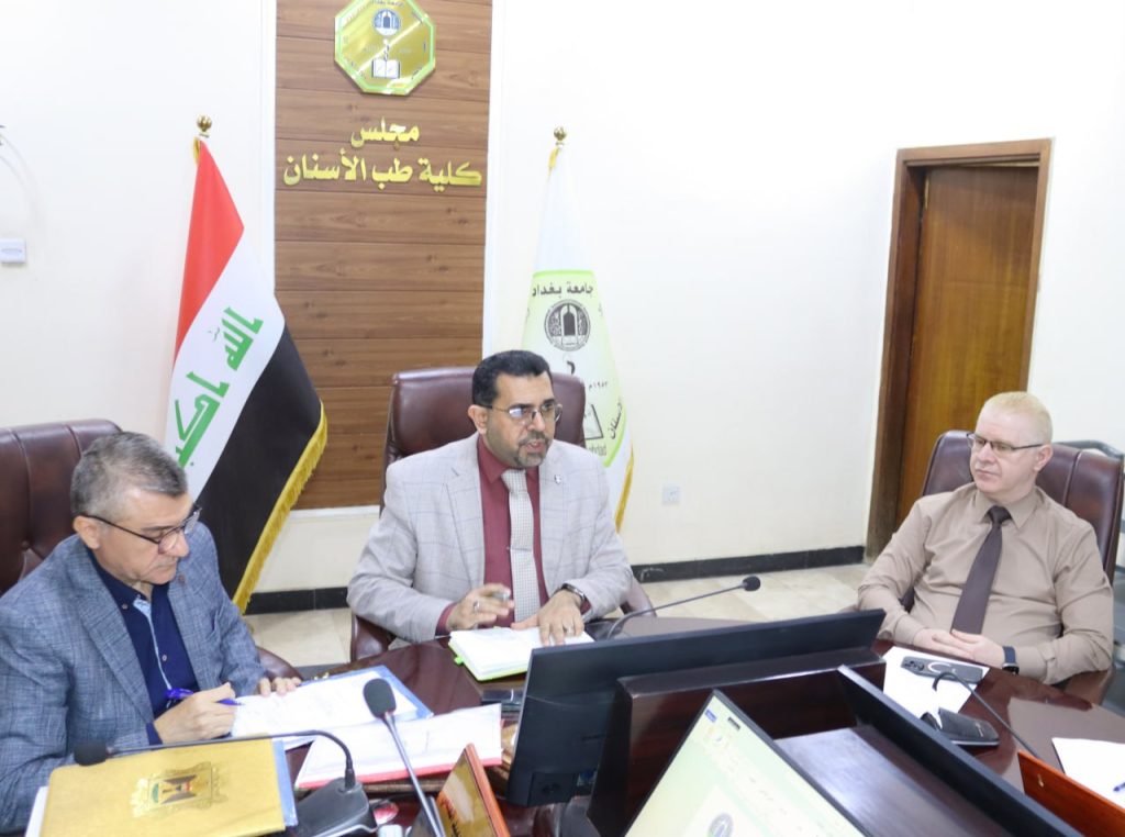 عقد الاجتماع الدوري لمجلس كلية طب الاسنان في جامعة بغداد حيث انعقدت الجلسة الحادي والعشرون يوم الاربعاء الموافق 25/2/2026 برئاسة السيد عميد كلية طب الاسنان الأستاذ الدكتور علي إسماعيل ابراهيم المحترم، وبحضور السيد المعاون العلمي ورؤساء الفروع العلمية.