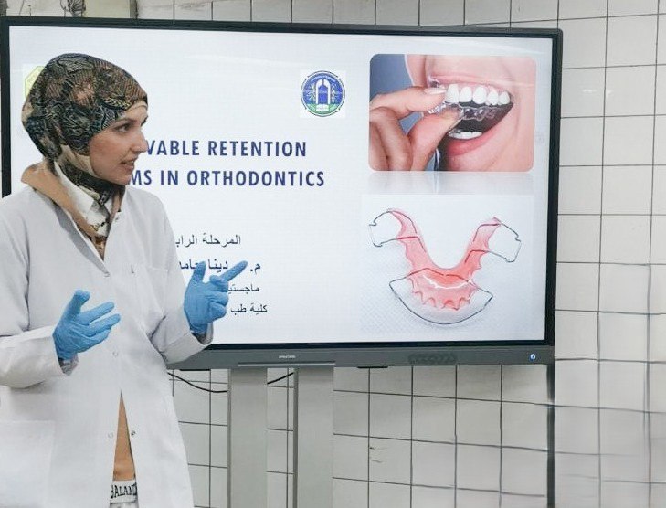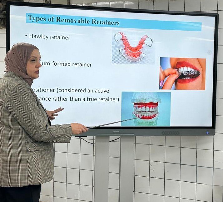 وتضمنت الدورة التدريبية عدد من المحاور تناولت مفهوم التثبيت في تقويم الأسنان وأهميته في منع الانتكاس بعد العلاج، مع شرح الأسس البيولوجية لإعادة تنظيم النسج الداعمة للأسنان. كما ناقش أنواع أجهزة التثبيت المتحركة المختلفة مثل Hawley retainer والـ Vacuum-formed retainers وخصائص كل منها ومؤشرات استخدامها. وتتطرقت الدورة ايضا إلى معايير اختيار نوع المثبّت وفق التشخيص الأولي، ونوع سوء الإطباق، وخطة العلاج السابقة. وكذلك استعرضت خطوات تصميم وتصنيع أجهزة التثبيت المتحركة، وطرق تسليمها للمريض وتعليمه كيفية استخدامها والعناية بها. وناقشت مدة التثبيت، وجدول المراجعات الدورية، والعوامل التي تزيد من احتمال الانتكاس، إضافة إلى عرض حالات سريرية توضح استراتيجيات ناجحة للحفاظ على النتائج التقويمية.