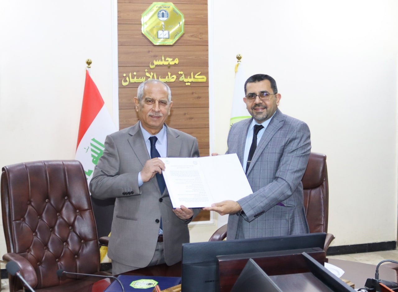 ضمن اطار تعزيز التعاون الاكاديمي والبحثي وتطوير مستوى التعليم في مجال طب الاسنان، وقعت كلية طب الاسنان بجامعة بغداد مذكرة توأمة وتعاون مشترك برعاية عميد الكلية أ. د. علي اسماعيل ابراهيم المحترم مع كلية طب الاسنان / جامعة بلاد الرافدين ممثلة بعميدها أ.م.د. مهند علي حمدون كشمولة المحترم.